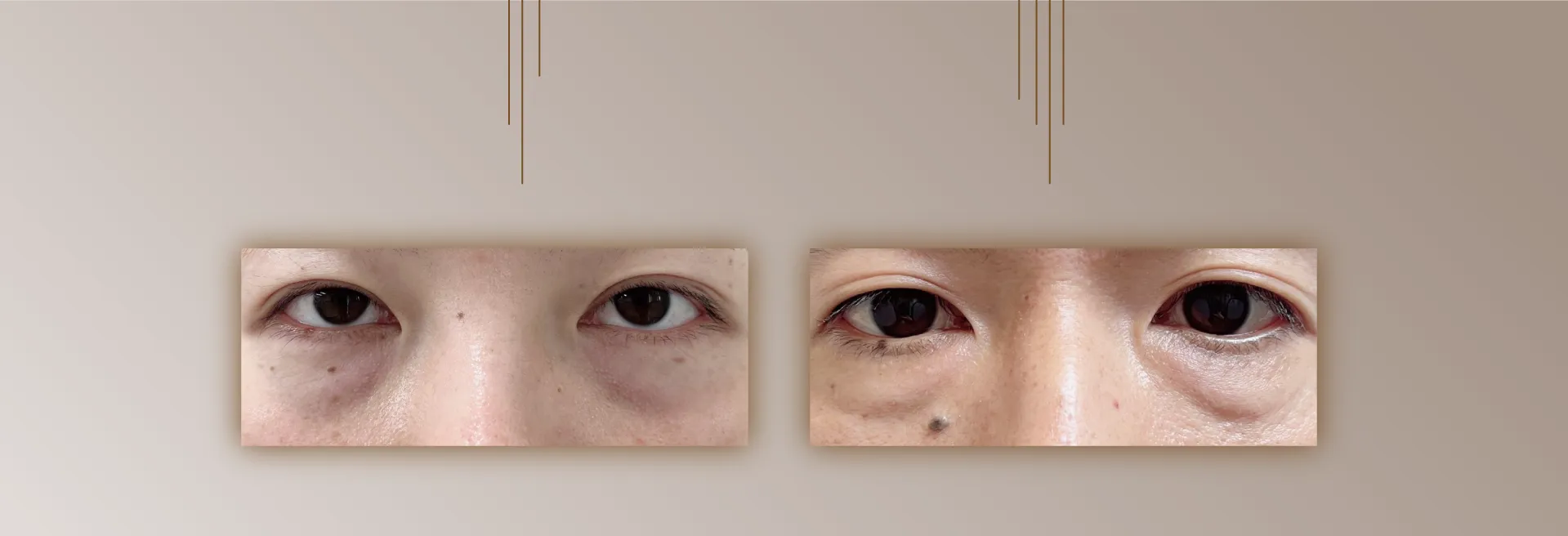 【施術の説明】お顔表面を切らずに目元の余分な脂肪を取り除き、若々しい目元にする施術です。